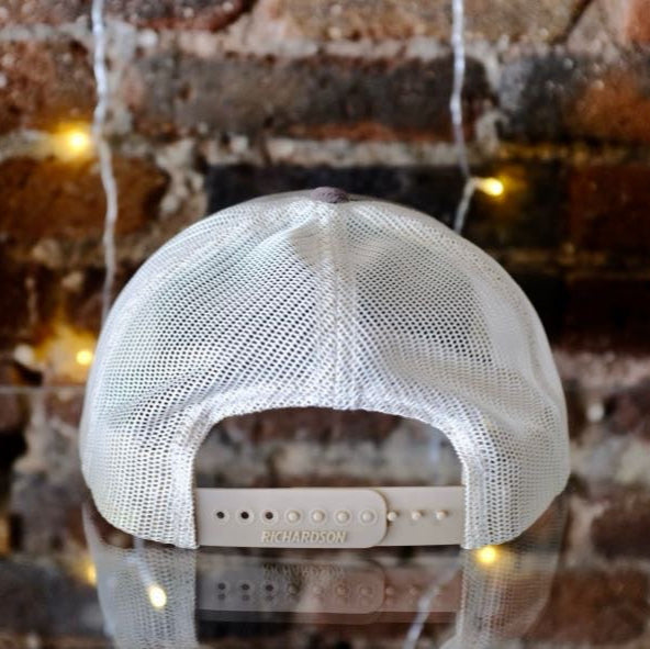 Grey & white corduroy trucker hat with mesh back and adjustable plastic snap strap