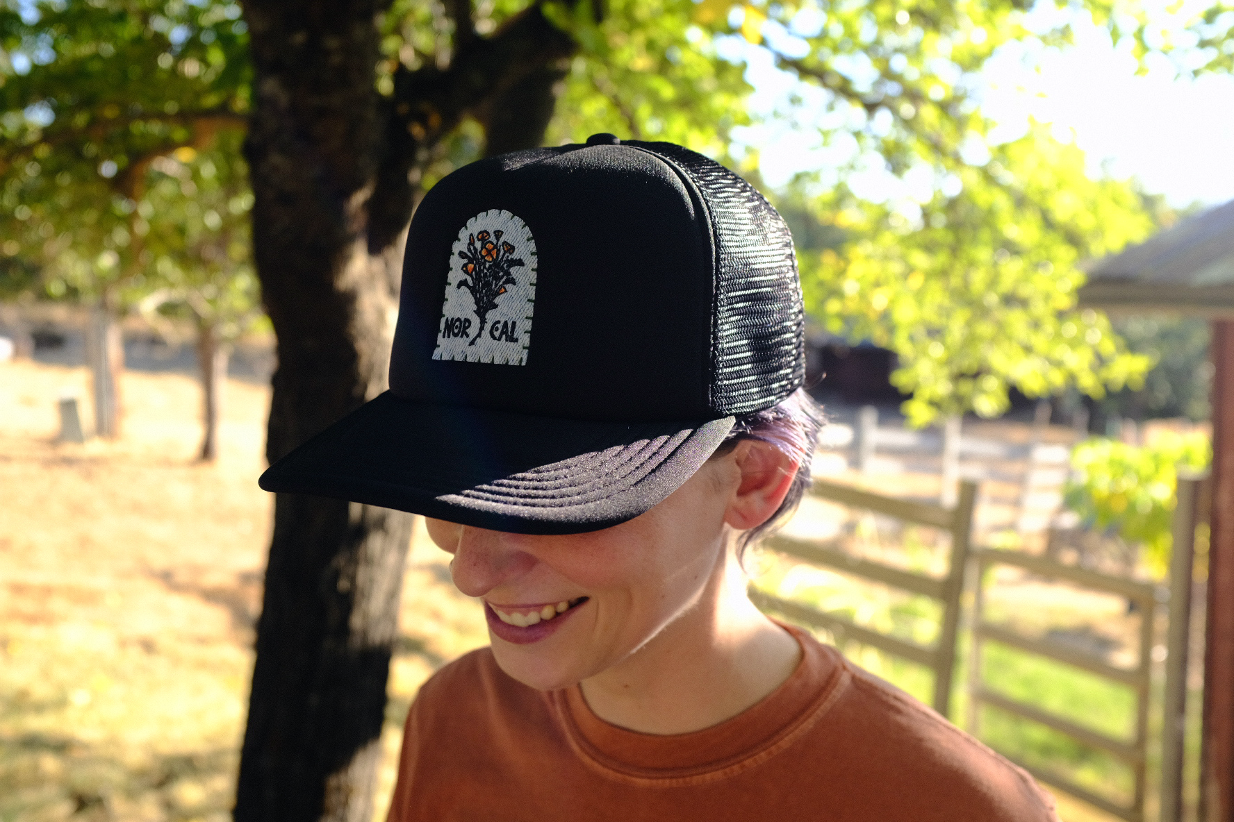 Black foam trucker hat, unisex and adjustable plastic snap strap